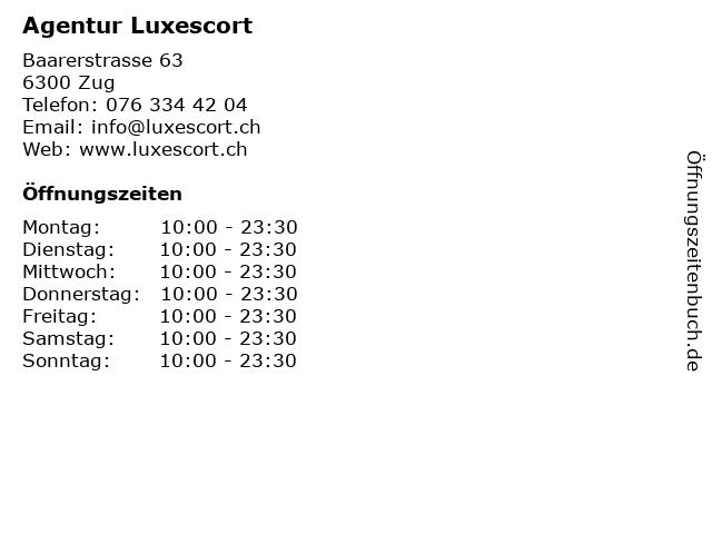 | Öffnungszeiten Agentur Luxescort in Zug anzeigen | |