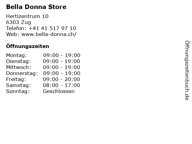 | Öffnungszeiten Bella Donna Store in Zug anzeigen | |