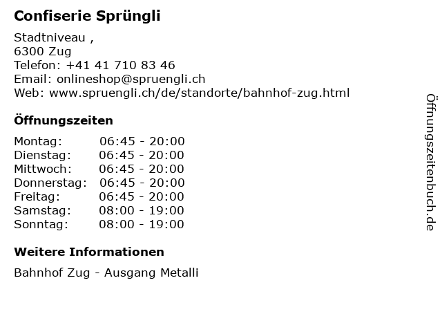 | Öffnungszeiten Confiserie Sprüngli in Zug anzeigen | |