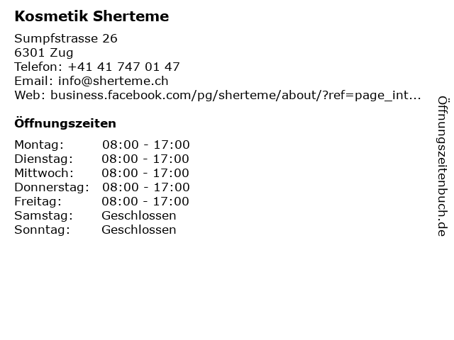 | Öffnungszeiten Kosmetik Sherteme in Zug anzeigen | |