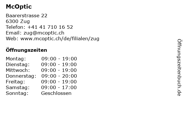 | Öffnungszeiten McOptic in Zug anzeigen | |