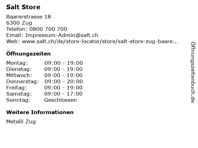 | Öffnungszeiten Salt Store in Zug anzeigen | |
