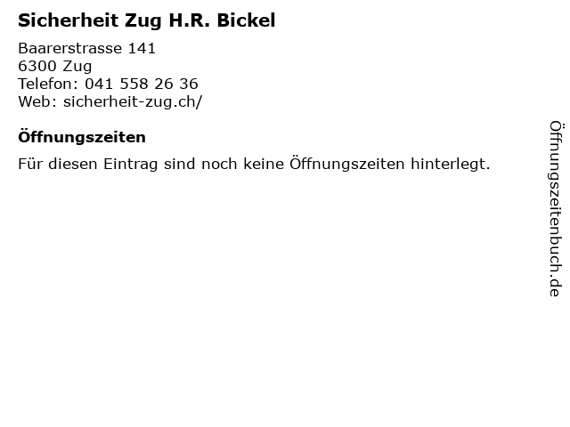 | Öffnungszeiten Sicherheit Zug H.R. Bickel in Zug anzeigen | |