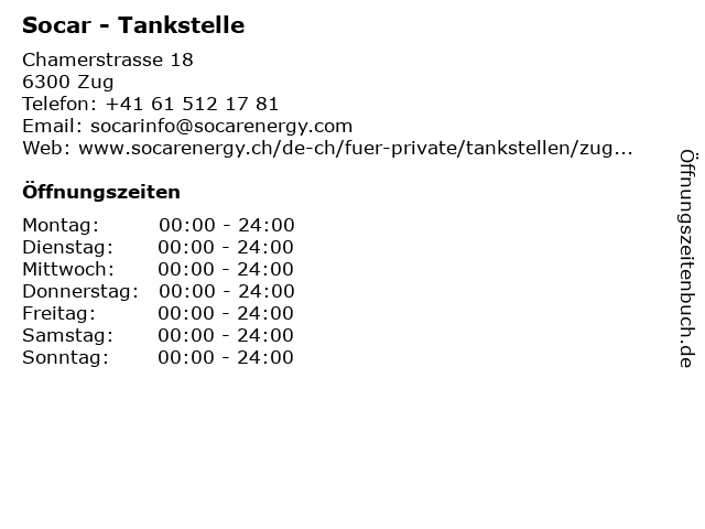 | Öffnungszeiten Socar - Tankstelle in Zug anzeigen | |