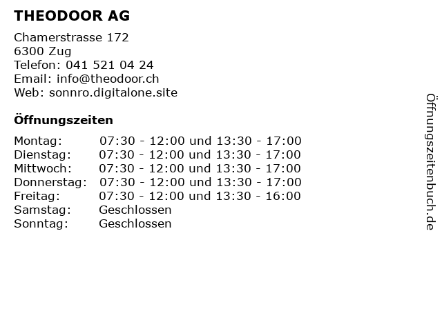 | Öffnungszeiten THEODOOR AG in Zug anzeigen | |