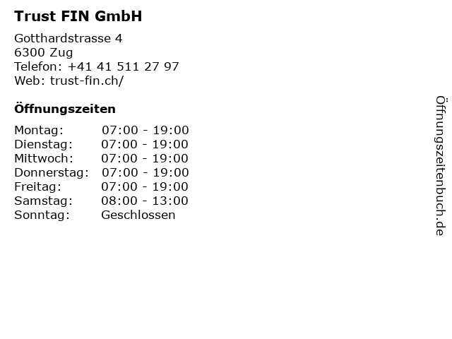 | Öffnungszeiten Trust FIN GmbH in Zug anzeigen | |