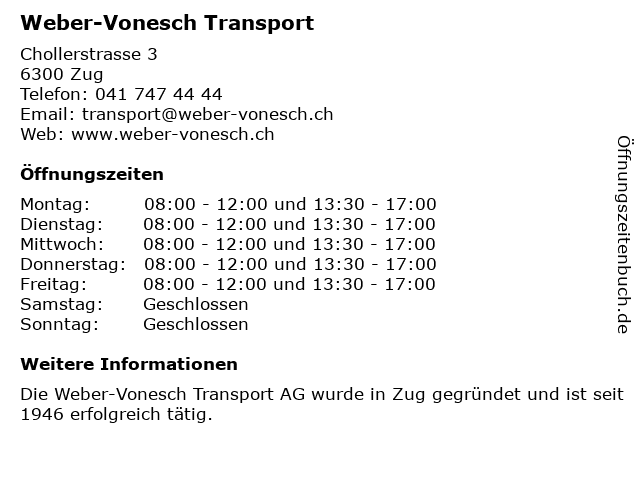 | Öffnungszeiten Weber-Vonesch Transport in Zug anzeigen | |