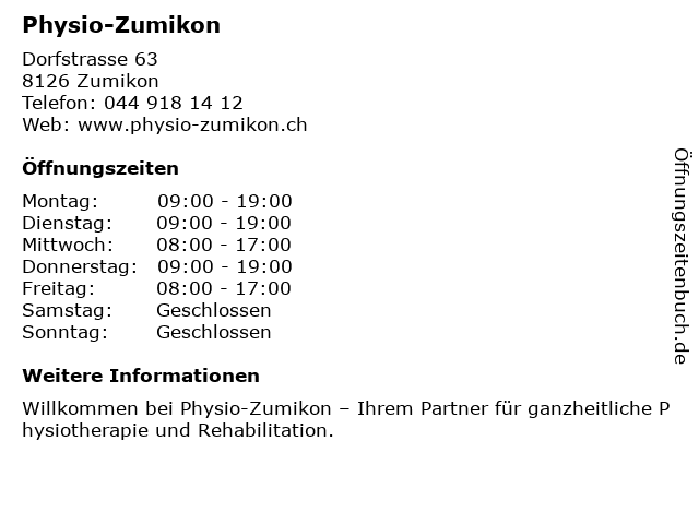 | Öffnungszeiten Physio-Zumikon in Zumikon anzeigen | |