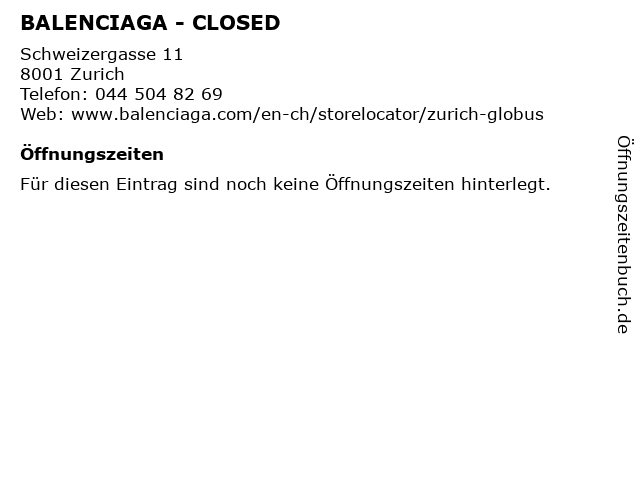 | Öffnungszeiten BALENCIAGA - CLOSED in Zurich anzeigen | |