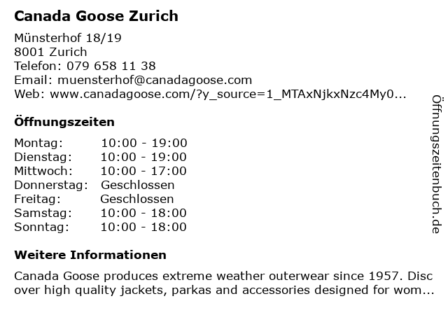 | Öffnungszeiten Canada Goose Zurich in Zurich anzeigen | |