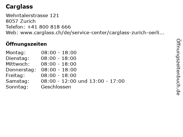 | Öffnungszeiten Carglass in Zurich anzeigen | |