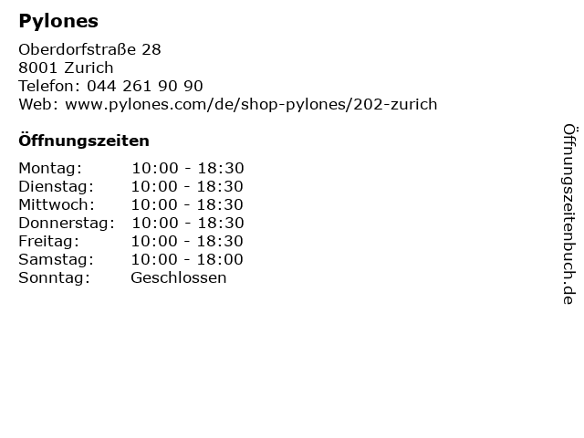 | Öffnungszeiten Pylones in Zurich anzeigen | |