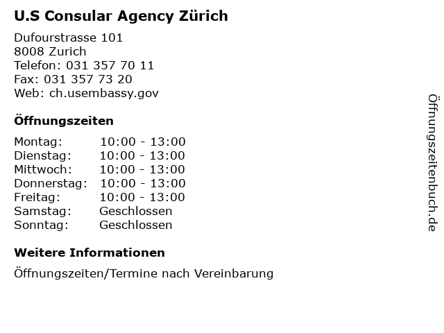 | Öffnungszeiten U.S Consular Agency Zürich in Zurich anzeigen | |