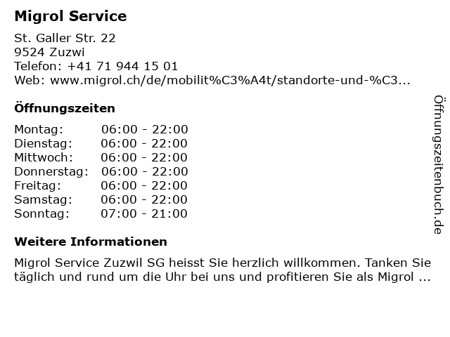 Öffnungszeiten Migrol Service in Zuzwi anzeigen | |