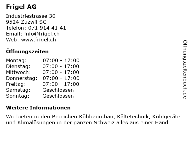 | Öffnungszeiten Frigel AG in Zuzwil SG anzeigen | |