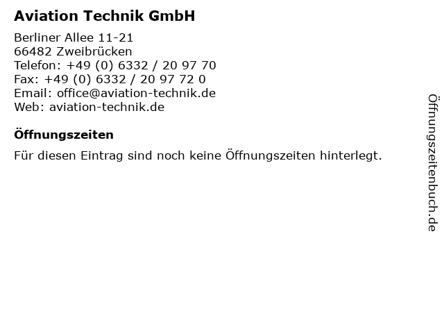 | Öffnungszeiten Aviation Technik GmbH in Zweibrücken anzeigen | |
