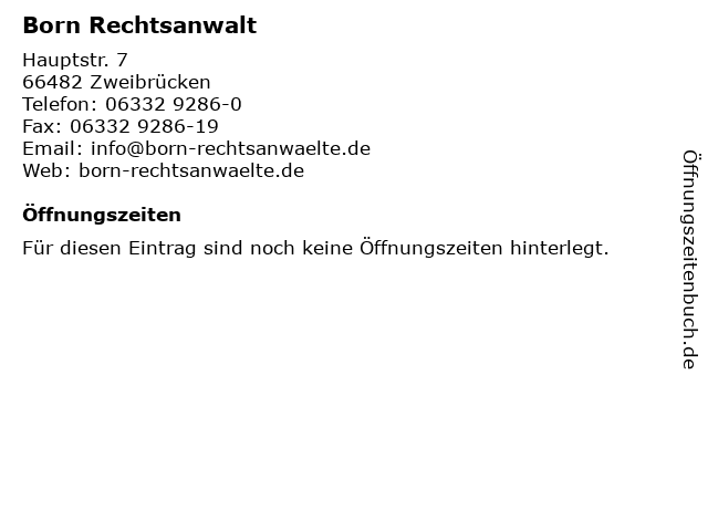 | Öffnungszeiten Born Rechtsanwalt in Zweibrücken anzeigen | |