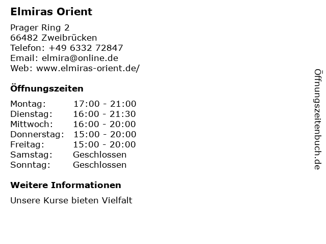 | Öffnungszeiten Elmiras Orient in Zweibrücken anzeigen | |