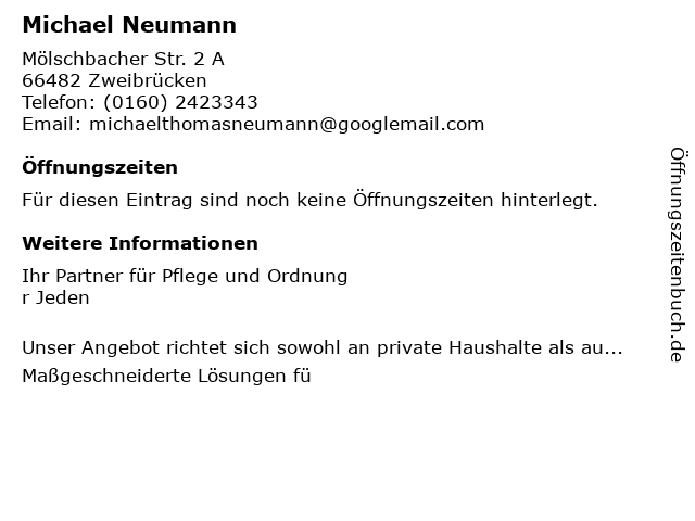 | Öffnungszeiten Michael Neumann in Zweibrücken anzeigen | |