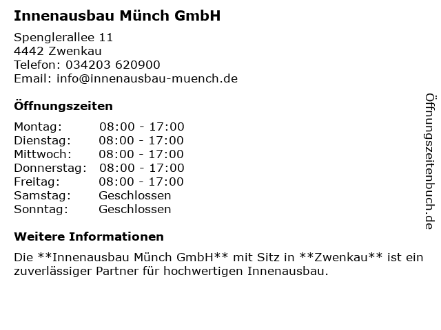 | Öffnungszeiten Innenausbau Münch GmbH in Zwenkau anzeigen | |