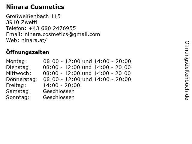 | Öffnungszeiten Ninara Cosmetics in Zwettl anzeigen | |