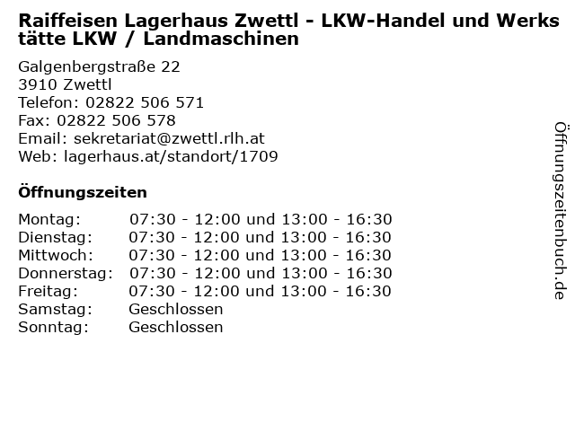 3 Raiffeisen Lagerhaus Zwettl eGenmbH EH-ES (Entfernung: 0,16 km) Pater Werner Deibl-Straße 7, 3910 Zwettl 4 Raiffeisen-Lagerhaus Zwettl eGen - Agrarhandel (Entfernung: 0,18 km) Pater Werner Deibl-Straße 3 / Obj. 11, 3910 Zwettl 6 |