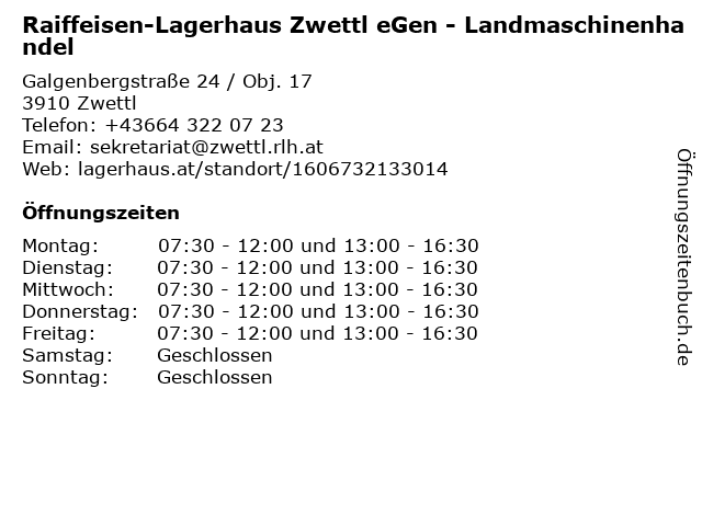 1 Raiffeisen-Lagerhaus Zwettl eGen - Landmaschinenhandel (Entfernung: 19,58 km) Neuhof 30, 3631 Ottenschlag 2 Raiffeisen-Lagerhaus Zwettl eGen - Ersatzteile (Entfernung: 0,02 km) Galgenbergstraße 22, 3910 Zwettl 3 Raiffeisen Lagerhaus Zwettl - LKW-Handel und Werkstätte LKW / Landmaschinen (Entfernung: 0,22 km) Galgenbergstraße 22, 3910 Zwettl 6 Raiffeisen Lagerhaus Zwettl eGenmbH EH-ES (Entfernung: 0,29 km) Pater Werner Deibl-Straße 7, 3910 Zwettl |