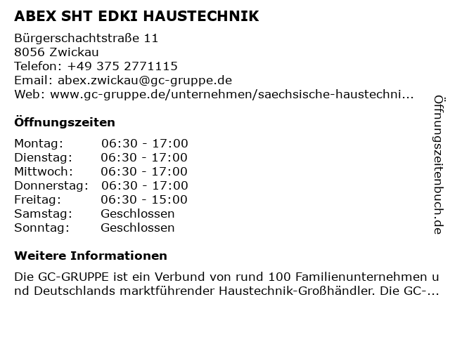| Öffnungszeiten ABEX SHT EDKI HAUSTECHNIK in Zwickau anzeigen | |