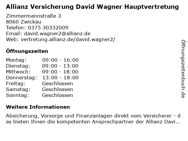 2 Allianz Versicherung Yvonne Wolf Hauptvertretung (Entfernung: 1,44 km) Bahnhofstraße 63, 08056 Zwickau 3 Allianz Versicherung Florian Colditz Hauptvertretung (Entfernung: 2,12 km) Jahnstraße 1, 08058 Zwickau 4 Allianz Versicherung Marcel Güttler Hauptvertretung (Entfernung: 2,27 km) Moritzstraße 31, 08056 Zwickau 5 Allianz Versicherung Erik Brauer Hauptvertretung (Entfernung: 2,31 km) Kreisigstraße 14, 08056 Zwickau 6 |