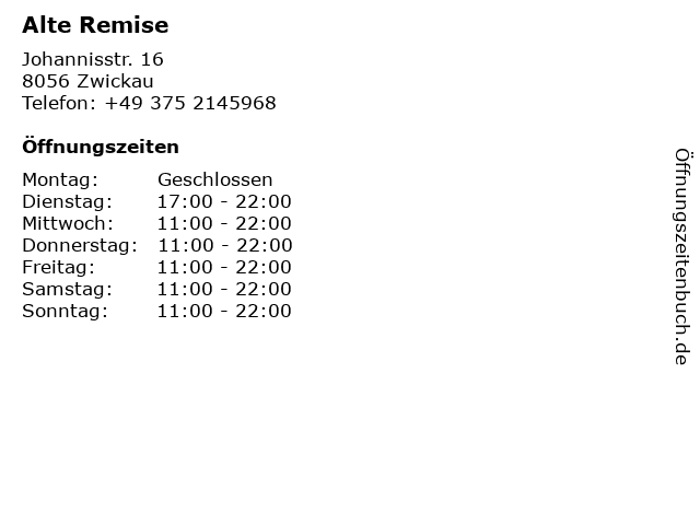| Öffnungszeiten Alte Remise in Zwickau anzeigen | |