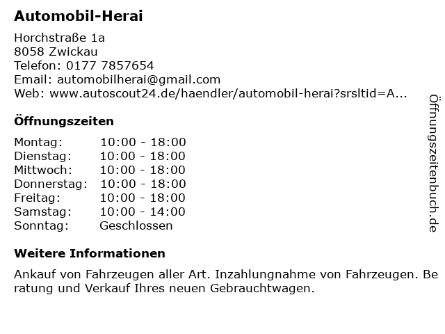 | Öffnungszeiten Automobil-Herai in Zwickau anzeigen | |