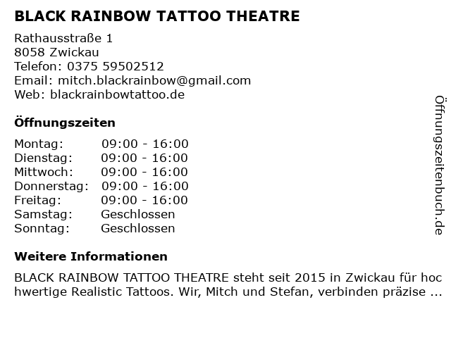 | Öffnungszeiten BLACK RAINBOW TATTOO THEATRE in Zwickau anzeigen | |