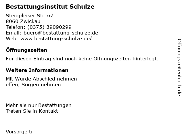 Öffnungszeiten Bestattungsinstitut Schulze in Zwickau anzeigen | |