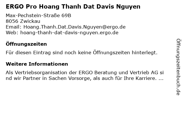| Öffnungszeiten ERGO Pro Hoang Thanh Dat Davis Nguyen in Zwickau anzeigen | |