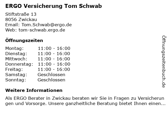 | Öffnungszeiten ERGO Versicherung Tom Schwab in Zwickau anzeigen | |