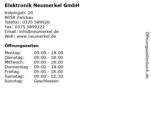 | Öffnungszeiten Elektronik Neumerkel GmbH in Zwickau anzeigen | |