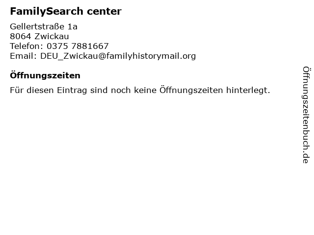 | Öffnungszeiten FamilySearch center in Zwickau anzeigen | |