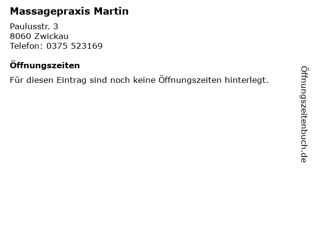 | Öffnungszeiten Massagepraxis Martin in Zwickau anzeigen | |