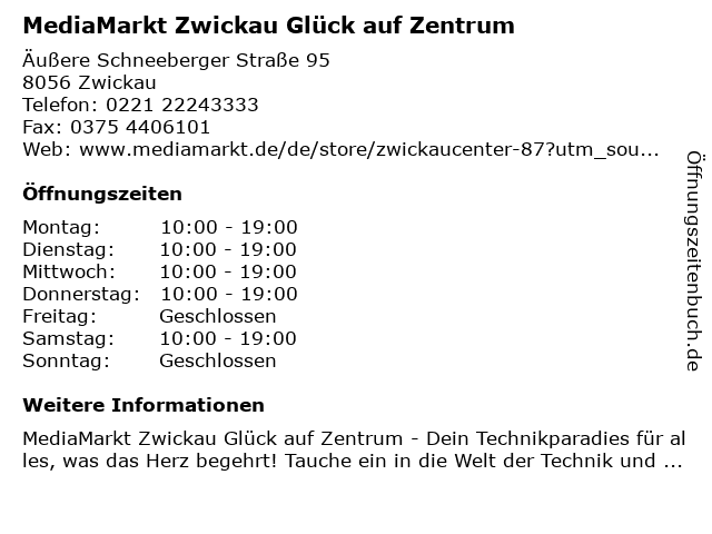 1 MediaMarkt Smartbar Handy Reparatur Zwickau (Entfernung: 0,01 km) Äußere Schneeberger Straße 95, 08056 Zwickau 6 |