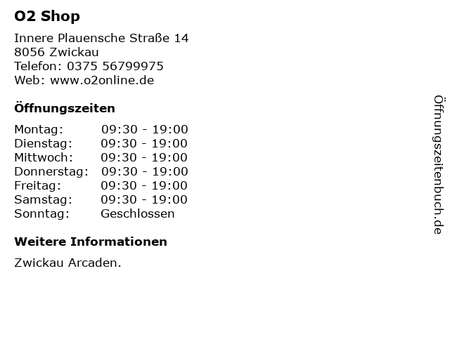 | Öffnungszeiten O2 Shop in Zwickau anzeigen | |