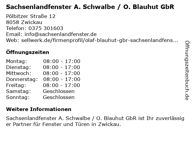 Branchen & Suchbegriffe zu Sachsenlandfenster A. Schwalbe / O. Blauhut GbR:a., blauhut, gbr, o., sachsenlandfenster, schwalbe |