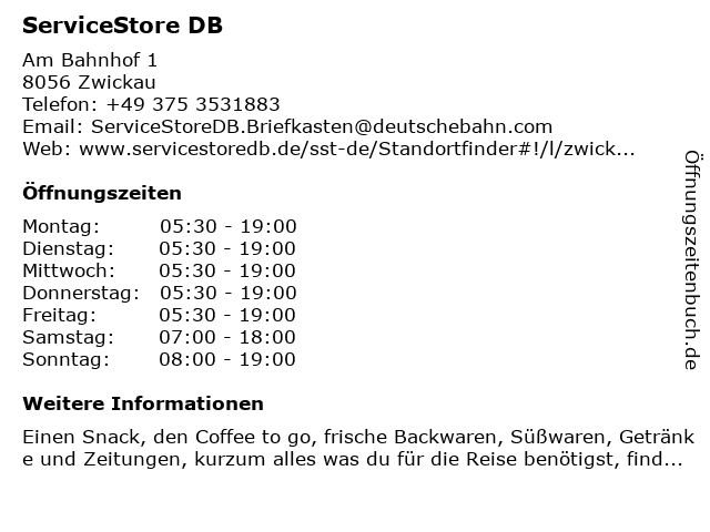 | Öffnungszeiten ServiceStore DB in Zwickau anzeigen | |