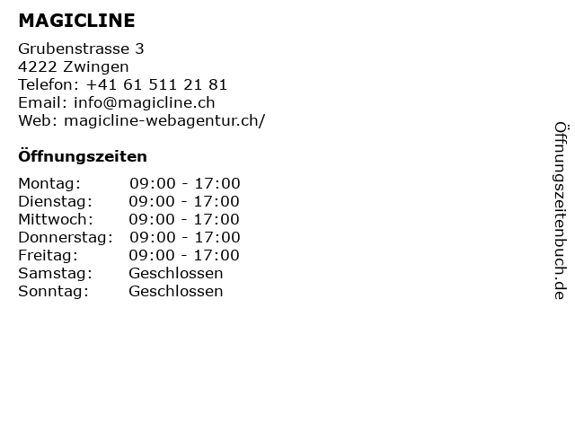 | Öffnungszeiten MAGICLINE in Zwingen anzeigen | |
